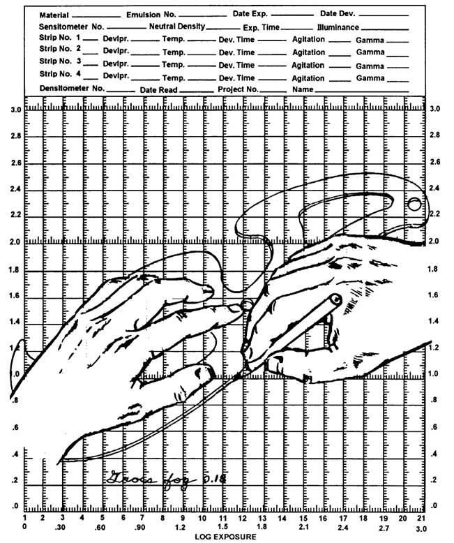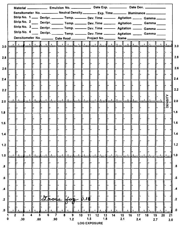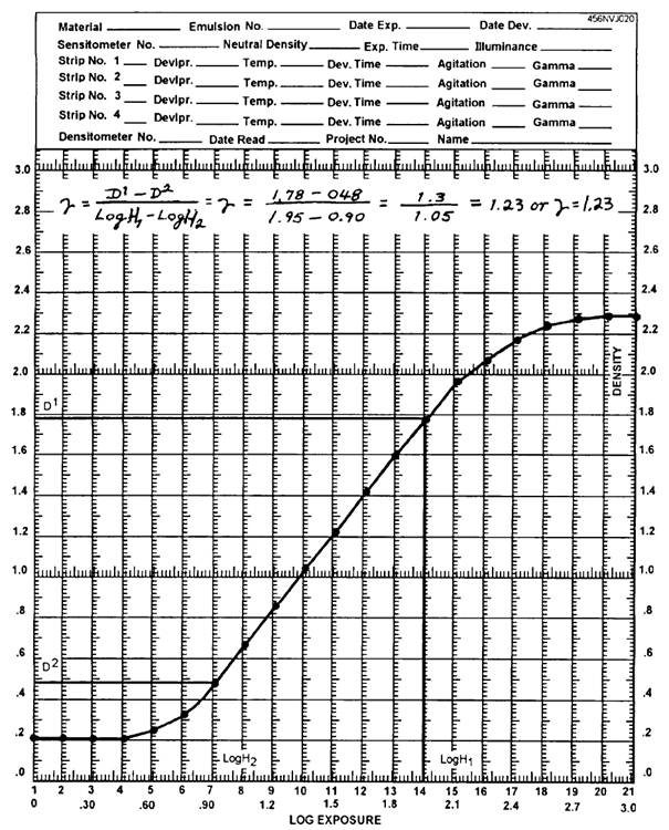 Figure 2-5.-Drawing the characteristic curve. Notice in the toe section of the illustration (fig. 2-6) that steps 1 through 4 do not show a change in density. This indicates that the film has not been affected by light, and the density is not a result of exposure, but of the emulsion base and the emulsion fog (gross fog) present in all emulsions. Step 5 shows a slight increase in density. This is called the threshold and indicates the least amount of exposure that will produce a noticeable change in density. Straight-Line Section Further to the right (fig 2-6) is a section of the curve that appears to be a straight line. Note that in many cases there will not be a well-defined straight line. This section of the curve has a constant slope, and in addition, the gradient of the slope here is greater than in any other part of the curve. In the straight-line section of the characteristic curve, there is an equal increase in density for an equal increase in exposure. This is the most important part of the curve. Subject exposures that fall on the straight line produce constant density differences. Shoulder Section The upper section of the curve fig. 2-6 is a convex, curved line that gradually decreases in slope. This section of the curve is called the shoulder. Like the toe area, equal changes in exposure do not produce equal differences in density. Tones of the subject falling very far up in this section are blocked; that is, reproduced with densities too heavy for printing or maximum detail. For normal exposures, bright highlight tones of the subject tend to be reproduced in the shoulder section of the curve. Exposure Although sensitometry is a tool of the lab technician, it also is significant to the photographer. Notice how this applies to exposing film. For example, when a uniformly lighted gray card is photographed, there is a single exposure, corresponding to a single point somewhere on the log-H axis. When the light on the surface of the gray card is increased and another photograph is made (maintaining the same camera settings), the exposure and the log H also increase. This causes a shift to the right on the log-H axis. There should be a corresponding increase in density, and the two factors again should plot on the characteristic curve. Extending this to a scene with a large number of luminances (reflectances) or high-luminance ratio, the tonal differences in the subject, the lighting, and the camera settings determine the film exposure that produces varying amounts of densities. These density differences must be related to the log-H differences that produce them; that is, density differences in the negative must be considered in their relationship with the tones of the subject. The density differences in a negative can be partially controlled by placing the exposures corresponding to the subject tones in the correct section of the characteristic curve. This is done by adjusting the camera settings correctly, providing that the range of tones in the subject is not too great. Emulsion Latitude The emulsion latitude is the exposure range where there is a proportional relationship between density differences and log-H differences. In other words, it is simply the range of exposure covered by the straight-line section of the characteristic curve fig 2-6. The latitude of an emulsion, therefore, determines the brightness range of the subject that can be reproduced proportionally. Latitude may be expressed either as the difference in log-H values between the two extreme points of the straight line or as the exposure ratio between these same two points. The emulsion latitude of light-sensitive materials varies according to the purpose for which it was designed-from 1:400 or more for long-scale panchromatic film, and from 1:20 or less for process film. For any given emulsion, the emulsion latitude varies according to the contrast. The emulsion latitude decreases as the contrast increases. Log Exposure Range The useful exposure range includes part of both extremities (toe and shoulder) as well as the straight-line section of the curve. For ground pictorial film the useful exposure range of a sensitized material is greater than the emulsion latitude, since portions of the toe and shoulder regions of the curve are used without sacrificing print quality. The approximate lower limit of the useful exposure range is the density point on the characteristic curve that is not less than 0.10 above the gross fog of the film. This point is referred to as minimum useful density. The upper limit is generally located at 90 percent of maximum density on the shoulder of the curve and is referred to as maximum useful density. In practice, many photographers use a much lower upper limit because of the high densities involved Exposure Latitude Exposure latitude is the allowable range of exposures for a given photographic emulsion. It varies with the brightness range of a scene. Film with a wide exposure latitude permits a greater variance of exposure and still produces an acceptable negative. Exposure latitude is associated with the useful log-exposure range and can be thought of as the margin of camera exposure error. Scenes that have a relatively low-luminance ratio and are photographed using a long-scale film have more exposure latitude than a scene with a high-luminance ratio using the same film. For example, you are photographing a subject with a luminance ratio of 60:1. This subject requires a log-exposure range of 1.78 (log of 60 = 1.78). The useful log-exposure range of the film/development combination is 2.70. This leaves a difference in logs of 0.92 (2.70 - 1.78 = 0.92). In this example, the exposure latitude is about three f/stops (remember, one f/stop = 0.30). Normally, the lower the contrast of the scene and the faster the film, the greater is the exposure latitude. Modem high-speed films have an overall exposure latitude of several stops for an average subject. However, regardless of the brightness