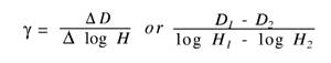 Figure 2-7-Computing Gamma. The values of D1, D2, log Hl, and log H2 are read directly from the graph. The mathematical computation for this method is shown at the top of figure 2-7 Quick method-This method uses a gamma gauge fig. 2-8 . The arrow of the gauge is placed on the straight-line section of the curve with its base line parallel to the log-H axis. Gamma is indicated where