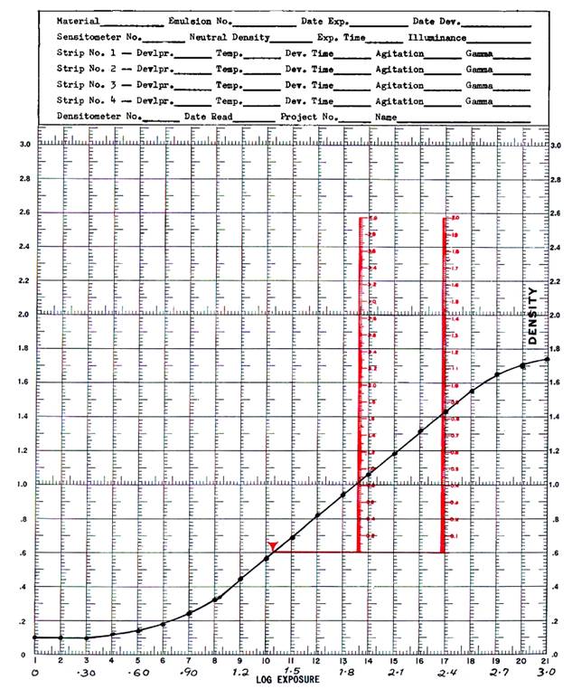 Figure 2-4.-Plotting points for the characteristic curve. density. This section is defined as a region of unequal rise, because the density does not increase equally for equal increases in exposure. Subject tones exposed in this section are reproduced with small, unequal density differences. Exposures made in this section of the curve lack detail. For ground pictorial photography, satisfactory exposures are made when the shadow areas of the subject fall in the toe area.