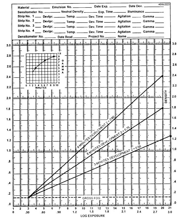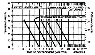 USING GAMMA AND CONTRAST INDEX For black-and-white ground pictorial photography, a gamma of about 0.65 to 0.90 or a contrast index of 0.56 to 0.60 is adequate for most printing systems. Some printing systems, such as those using specular light sources, require a lower CI. For these systems, a lower value may be more suitable. The best gamma or contrast index for a particular printing system can be determined only through practical tests. These tests can be made by developing several equally exposed films to different gamma or contrast-index values. The negative with a gamma or CI value that prints best on your printing system is then used. When using variable contrast paper, you should aim for negatives that print well with a No. 2 filter. Time-Gamma and Time-Contrast Index Curves Time-gamma or time-contrast index curves are plotted to summarize the behavior of any film-developer combination. Time-gamma or time-contrast index curves are used to indicate the time of development required to reach a desired gamma or contrast index. Time-gamma and time-contrast index charts can be made to show the maximum gamma (gamma infinity) or maximum contrast index (contrast index infinity) obtainable with a given film-developer combination. Figure 2-10 shows a time-gamma curve and the family of curves that produced it. A small graph is drawn in the upper left comer of the graph on which the family of curves is plotted. The horizontal axis of the small graph indicates time of development in minutes and the vertical axis indicates gamma or contrast index, as appropriate. The gamma or contrast index obtained from each sensitometric strip of the film being tested is plotted against the time required to produce it by placing dots in their proper position on the graph. A french curve is used to connect the dots. To use the curves, select the required gamma or contrast index from the vertical column of the small graph, and read the development time needed from the times given just below the base line, or horizontal axis. These times should be based on negatives made under average conditions. If the negatives subsequently developed are too low in contrast, choose a higher gamma, or contrast-index value. When the contrast is too high, choose a lower value. The processing latitude is the range in times of development for any given tolerance in gamma or contrast index. The processing latitude may be found by determining the minimum and maximum gammas or contrast indices that are acceptable. By examining the time-gamma or time-contrast index curve, you will notice that as development increases, gamma or contrast index also increases. This increase is rapid at first and then increases more slowly. After a period of time, there is little increase in gamma or contrast index, even though development is prolonged This indicates that for any particular emulsion and development condition, the higher the gamma or contrast index, the greater the processing latitude. This also indicates that the lower the gamma or contrast index, the more precise processing conditions must be to obtain uniform development. Time-Temperature Charts One of the primary factors affecting the amount of development and the formation of density of an image is the temperature of the developer. The higher the temperature, the greater the activity of the solution. As the temperature drops, the developing time must be increased. Since gamma or contrast index must also be considered, typical time-temperature charts include a gamma and/or contrast-index value that varies according to development time and temperature. By consulting a time-gamma or a time-contrast index temperature chart, you can determine the proper developing time under varying conditions. These charts are published by film manufacturers and can be seen throughout the Photo-Lab Index. Figure 2-11 is a typical time-gamma chart. To use a time-gamma or time-contrast index temperature chart, follow the line indicating the temperature at which you are processing until the desired gamma or contrast-index line is intersected. From this point, drop straight down to the time of development line. The intersection of the vertical line and the time of development line indicates the proper developing time at the recommended agitation. For example, using figure 2-11, assume the film is to be processed at 70F to a gamma of 0.90. Find 70F and follow the horizontal
