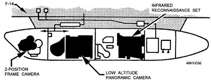 TACTICAL AIR RECONNAISSANCE POD SYSTEM (TARPS) With the development of F-14 Tomcats equipped with the Tactical Air Reconnaissance Pod System (TARPS), the Navy continues to improve its photographic reconnaissance capabilities fig 47. TARPS, when fully configured for the tactical reconnaissance function, contains two photographic sensors (cameras): one infrared reconnaissance set (IRRS)-the electronics required to operate the cameras and the IRRS-and the auxiliary equipment to support the system (fig 4-8) . The TARPS can be used in a variety of tactical photo reconnaissance situations, such as target acquisition, prestrike target identification, poststrike target assessment, target tracking, maritime surveillance, and map surveillance. The TARPS is designed to provide day and night and low-to-high altitude reconnaissance. Operation of TARPS is controlled by the naval flight officer/radar intercept officer (NFO/RIO). Additionally, the pilot is provided with camera ON-OFF capability. The TARPS-equipped Tomcats retain a significant offensive capability, even when carrying out a photographic role. The aircraft can be returned to a full-combat
