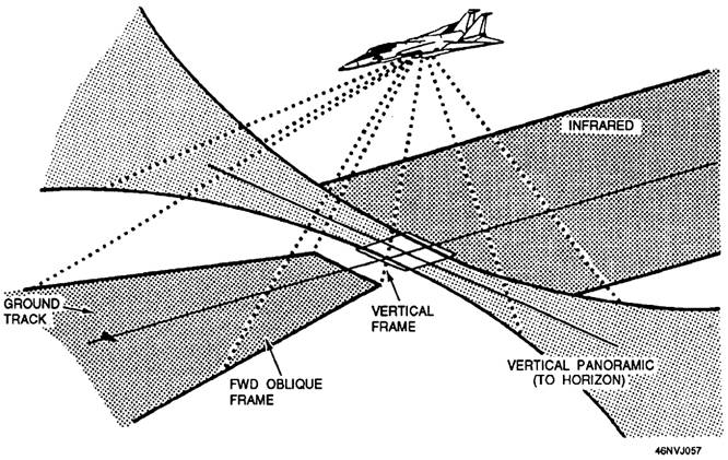 Figure 4-9.-Sensor coverage of TARPS. Class C school (NEC 8345) is assigned to an F-14 squadron and is responsible for the maintenance of TARP fig. 4-10. Currently the F/A-18 Hornet has a 35mm strike-camera capability installed in the nose of the aircraft. The F/A-18 is a supersonic, twin-engine jet designed as a multimission (fighter, attack, and reconnaissance) aircraft that has been in service since the 1980s. |