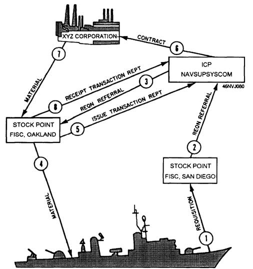 CHAPTER 5 SUPPLY AND LOGISTICS In every imaging facility, someone is in charge of ordering and maintaining supplies. Large imaging facilities have an Aviation Storekeeper (AK) assigned to manage supplies and equipment. In small imaging facilities and aboard ship, you may be assigned this responsibility as the division supply petty officer. Many Sailors are afraid of the Navy Supply System at first. This is understandable since it is such a large system. What is even more astonishing is that it is only part of an enormous supply system that includes all of the U.S. government and even provides services to Allied Military Forces in NATO. Obtaining the supplies you need from a system such as this is not easy. This chapter provides you with some information and insight into the supply system so you can approach it with confidence. As a first step, you must know the various sources from which supplies are procured. THE SOURCE The Federal Government attempts to "buy American" whenever possible. The supplies you order are made under contract, purchased in wholesale lots, and are sometimes bought as individual pieces by various government agencies including the Navy. When ordering supplies, you tap into this vast reservoir of materials. The Navy Supply System draws on its own resources, the resources of other U.S. government services, or on the resources of U.S. government civilian agencies to fill your order. The supply system must catalog every item available from the government to accomplish this. As a Photographer's Mate, you must become familiar with the Naval Supply Systems Command (NAVSUPSYSCOM). This command manages the inventories of the types of supplies you use the most. Navy inventory managers are responsible for assigned groups or categories of items of supply. Navy inventory managers include the systems commands and also project managers, bureaus, offices, and inventory control points (ICPs) under the command of NAVSUPSYSCOM. They are stocked at locations close by to ensure supplies are readily available to the fleet. STOCK POINTS Stock points consist of Fleet and Industrial Supply Centers (FISCs). The mission of these activities is to furnish supply support to fleet units, shore activities, transient ships, and overseas bases. They do this by procuring, receiving, storing, issuing, and shipping or making other distribution of Navy, Defense Logistics Agency (DLA), and General Services Administration (GSA) controlled materials. The Defense Logistics Agency manages supply items used commonly by each of the military services. The following activities are stock points for the Navy Supply System: FISC Norfolk FISC Oakland FISC Pearl Harbor FISC Puget Sound FISC San Diego FISC Guam FISC Yokosuka FISC Jacksonville FISC Pensacola The following scenario will provide you with some insight on methods used by inventory managers and stock points to fill a supply order fig 5-1 1. USS Chance submits a requisition to FISC San Diego for a piece of equipment. 2. FISC San Diego receives the requisition from USS Chance, reviews their records, and determines that the item is not stocked at the center. FISC San Diego then refers the requisition to NAVSUPSYSCOM. 3. NAVSUPSYSCOM receives a requisition referral from FISC San Diego, reviews their master records, and determines that the equipment is stocked and available at FISC Oakland. NAVSUPSYSCOM refers the requisition to them. 4. FISC Oakland receives a requisition referral from NAVSUPSYSCOM and issues the item to USS Chance.