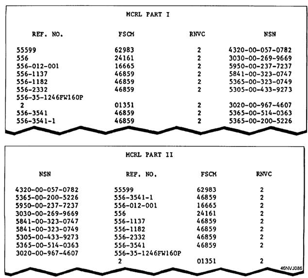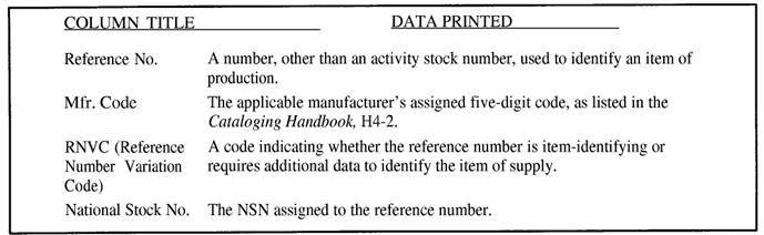 Figure 5-7.-Columns of the Consolidated Master Cross-Reference List, part I and part II. supply system. Part II includes supply items that are used by all military services; therefore, many NSNs will be identified in the C-MCRL that are not listed in the Management List-Nav fig. 5-7. The information obtained in part I of the C-MCRL is shown in table 5-1 The Reference Number Variation Code (RNVC) row indicates (by use of the numbers 1,2,3, and 9) those items that require supplementary data to identify them fully. These codes are as follows: Code 1 -Nonidentifying-The reference number does not completely identify the item. When the reference number is cited, it must be accompanied by additional descriptive data, such as color, length, and rating. Code 2-Identifying-The reference number in company with the Federal Supply Code for Manufacturers (FSCM) completely and uniquely identifies the item of supply. Code 2 items may also have nonidentifying reference numbers. Code 3-The reference number is a vendor's number or a Source Control Item. Code 9-This code is used to indicate (1) the reference number is for information only and (2) the reference number or specification is obsolete or superseded.