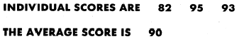Whenever you wish to print several variables with one PRINT statement, you must separate them with either commas or semicolons, as was done in line number 10 of the example. The commas will give you standard spacing. If semicolons had been used, we would have gotten packed spacing. More on the use of the comma and semicolon will be discussed later in the chapter. Printing the results of a computation is another use of the PRINT statement. Lets suppose we want to get the average of three scores: 82, 95, and 93. First we must define the problem: how to compute an average. You add up the scores and divide by the number of scores. This problem can be solved by using a PRINT statement like this: Example: Print the results of a computation