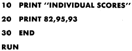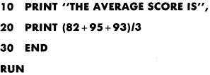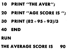 printed output to come out on the same line with the message printed together followed by the numeric data. Some important points to remember about the PRINT statement are: It will print any message enclosed in quotation marks. It will print any number or variable. It will calculate and print the result of an expression. A blank PRINT statement will cause a blank line in your output. When a comma is used as a separator, normal spacing (16 spaces per field) is achieved. When a comma is used at the end of a PRINT statement, the data in the next PRINT statement is continued on the same line beginning in the next print zone. When " " (quote, blank, quote) is used as a print field the computer will skip to the next print field. You are actually telling the computer to print a blank field. On some computers, two commas (,,) together will produce the same results.When a semicolon is used as a separator, packed spacing is achieved.When a semicolon is used at the end of a PRINT statement. the information contained in the next PRINT statement is continued on the same line.PRINT statements can become awkward when many computations are to be done or the results of computations are to be used in other calculations.The results of computations done in a PRINT statement are not stored in the computers memory; therefore, away is needed to store data or the results of computations for later use. The LET statement will do this, since computations done in a LET statement are stored in the computers memory. |
