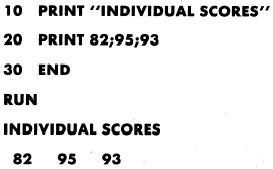 Here we have a blank field. The second data element started in the third print zone or field instead of the second, because of the two commas used together.SEMICOLON.NOW lets examine the second punctuation mark used in PRINT statements, the semicolon. When a semicolon is used in a PRINT statement, messages are printed together without any spaces (packed spacing). However, numeric data will be printed with two spaces between each number, one space is reserved for the minus sign. Like the comma, a semicolon used at the end of a PRINT statement causes the information in the next PRINT statement to be printed on the same line. The following examples show the effect a semicolon has on a PRINT statement.Example: Using semicolons as separators