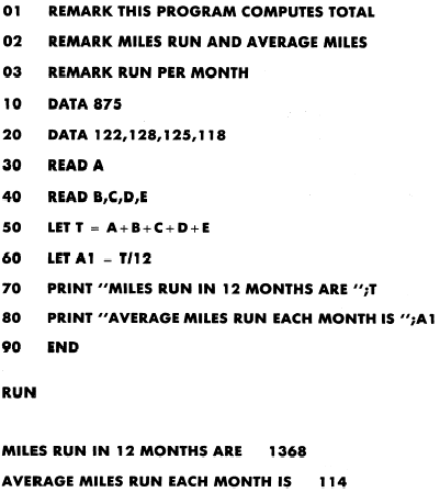 When the READ statement is executed, you will NOT get an error message, rather the values 6 and 5 in the DATA statement will be ignored. All variables in READ statements, and all values in DATA statements are separated by commas. Although DATA statements can be placed anywhere in the program, it is a good programming practice to place them all together either at the beginning or end of the program. This will make them easier to find and to change when you want to run the same program using different data.If you have programmed in another language, youll notice that BASIC is different because the size of your data elements do not have to be defined. In COBOL your data elements must be defined using a PICTURE clause, and in FORTRAN they must be defined using a FORMAT statement. BASIC accepts the data elements just as they appear in the DATA statement.When you are coding DATA statements, you should ensure that the values in the DATA statements are in the same order as the variable names specified by the READ statements. DATA statements are used in the same order-as they appear in the program.Now lets see how the READ and DATA statements work in solving a problem.Suppose you have been in the "Run for your Life" program for 12 months. The first 8 months you ran 875 miles. During the next 4 months your monthly mileages were 122, 128, 125, and 118. You want to write a program that will compute and print the number of miles you ran in the 12 month period and your monthly average. A program to do this could be written this way: