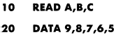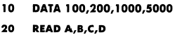 When a READ statement is executed, the values in the data list are assigned consecutively to the variable names in the READ statement. The first variable name (A) in the READ statement is assigned to the first value (100) in the DATA statement, the second variable name (B) to the second value (200), and so on. At any given time, there is one value at the top of the data list and after it is used, the next one comes to the top of the list.Each READ statement causes as many values to be taken from the data list as there are variable names in the READ statement. When you are reading several variables, care should be taken to ensure that the number of variables assigned in one or more READ statements is equal to the number of values assigned in one or more DATA statements. An excess of data in DATA statements is ignored by the computer, but insufficient data will result in an error message, and the computer will halt execution of the program.Example: Data list too short