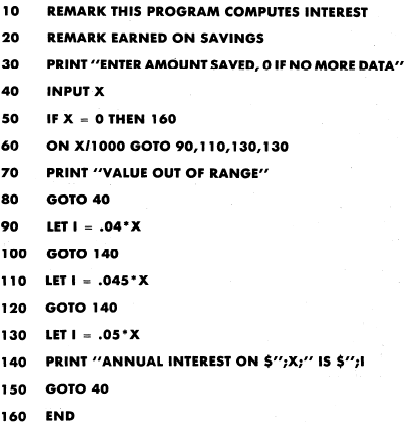 The following program asks you to enter the amount saved, between $1000 and $4999, then uses the ON-GOTO to determine what interest rate to use in calculating the amount of interest earned.