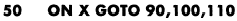ON-GOTO Statement (Conditional) The IF-THEN statement allows the computer to follow one of two possible paths. The ON-GOTO differs from the IF-THEN statementit allows many branches or alternative paths. Several IF-THEN statements could be combined to produce the same results; however, the ON-GOTO statement can be more efficient. It conditionally transfers control to one of several lines, depending on the value of an expression in the ON-GOTO statement when it is executed.In an ON-GOTO statement, the expression is evaluated and the result truncated to obtain an integer, whose value is then used to select a line number from the list following the GOTO. If the value of the integer is 1, the computer goes to the first line number; if it is 2, the computer goes to the second line number and so forth.Example: