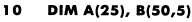 This DIM statement would reserve memory space for an array named A with 25 elements, and an array named B with 50 rows and 5 columns. On some computers the first element in a one-dimensional array is referenced with subscript 0, and in a two-dimensional array by subscripts, 0, 0. If that is the case on your computer, you would set the upper limits at one less than the number of elements you need.When the BASIC interpreter encounters a DIM statement such as the one above, it reserves an area in memory for arrays A and B made up of 25 and 250 elements respectively.If an array requires less storage space than is automatically reserved by the BASIC interpreter it need not be defined by a DIM statement. However, by using a DIM statement only the space actually needed will be reserved.Arrays Some important things to remember about arrays: (all numeric or all string). An array that contains numeric elements must be named with a single letter.A string array is referred to with a letter followed by a dollar sign. Elements in a one-dimensional array are referenced by the array name followed by a subscript in parentheses, A(l).Elements in a two-dimensional array, matrix, are referenced by the name followed by two subscripts in parentheses; the first References the row, the second the column, A(2,3).Subscripts may be a numeric-constant or a numeric-variable. Each array name in a program must be unique. However, an array and an ordinary variable can have the same name. Duplicating array names and variable names could be logically confusing; therefore, it is not a recommended practice.Many computers have a special set of instructions called MAT instructions for working with matrices. By using a single MAT instruction, matrices may be defined, added, subtracted, multiplied, read, and manipulated in a variety of ways. Any of these operations may be done with FOR-NEXT loops; however, the MAT statement, if available, makes it easier. See Appendix II for examples and refer to the users manual for your specific computer. |