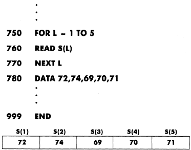 In this example, the loop will be executed five times. The variable used to control the loop is also used as the subscript for S in the READ statement. On the first pass through the loop, the subscript L is 1, the value of L during the first execution of the loop. On the second pass, the subscript will be 2, and so on, until the value of L is equal to 5.Subscripted variables can also be used to identify elements in tables (two-dimensional arrays) but it takes two subscripts, one to specify the row and a second one to specify the column. For example, S(2,5) would specify the location of the value in the second row, fifth column. Figure 5-1 is an example of a two-dimensional array.DIM (DIMENSION) Statement As stated earlier a method is needed to specify the size of an array. The BASIC programming language automatically assigns 11 elements to every one-dimensional array and 121 elements (11 rows and 11 columns) to every two-dimensional array appearing in a program.Larger arrays may be used. However, the size of each must be defined; that is, you must specify the maximum number of elements in each. The follow-ing example shows how a DIM statement is constructed.Example: