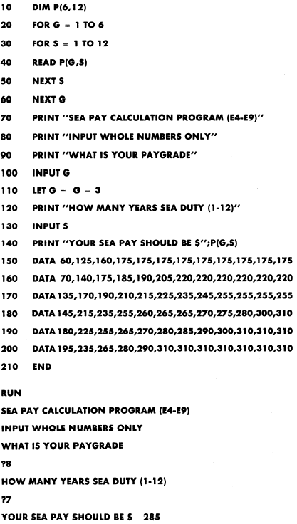 As seen in the output from this program, an E-8 with 7 years sea duty would receive $285.00 sea pay. Try the program and see what your sea pay would be.The paygrade (4-9) is entered (line 100). Before it can be used as a subscript to determine row number, we subtract 3 (line 110). This makes it correspond to row number 1-6. Next, years of sea duty (1-12) are entered to be used as the subscript for column number. Then the PRINT statement (line 140) prints the corresponding value of the coordinates G and S from the matrix named P. |