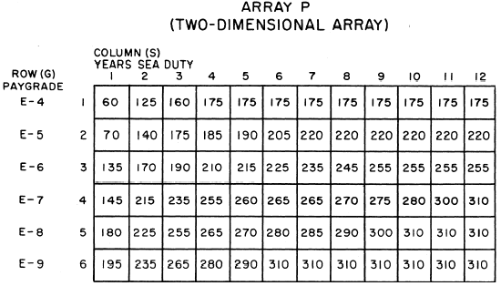 Sample Problem Using Nested Loops and a Matrix Suppose you wanted to write a program to compute your career sea pay based on your paygrade and years of sea duty. You would need a two-dimensional array (matrix) to store the data. Figure 5-1 shows the table of values needed to determine sea pay.Examine the following program and see how the matrix is constructed. The program contains nested loops (lines 20-60) which are used to read the values into the matrix. The outer loop sets up the row portion, G, which represents paygrade. The inner loop sets up the column portion, S, which represents the years of sea duty.
