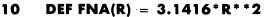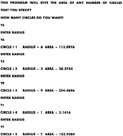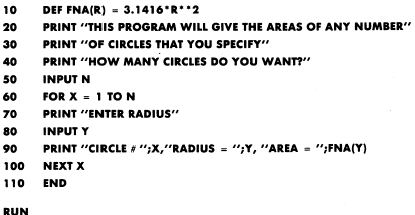 The function to compute the area of a circle is defined in line 10. The PRINT statement, line 90, References the defined function to print the area of the circle. The variable name (R) used in the DEF statement is not the same as the one (Y) used in the PRINT statement where the function is referenced, rather it corresponds to the variable name used in the INPUT statement, line 80 |