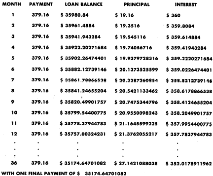 In this example the TAB functions caused the computer to tabulate to the specified print positions and print whatever values followed each TAB function. In the PRINT statements, lines 30 and 40, the values were the column headings; in lines 110 and 120, dollar signs followed by the values of the variables were printed, beginning in the specified print positions. The space between the dollar sign and the number is reserved for the minus sign, if the number is negative.In the previous example, the headings look nice, but look at the numbers. You would not want an amortization schedule with cents expressed to five or more decimal places, and without commas to make the dollar values easier to read. Although we used the TAB function to specify where the column should be printed, we let the computer format each output field automatically. By using the PRINT USING statement we can override the print-zone restrictions and further enhance the appearance of the output. |