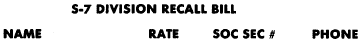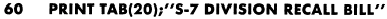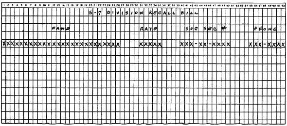 This will give you the number of blank print positions to be left on each side of the heading. If it works out that you have an unequal number of positions before and after the heading, the extra position can be put after the heading. However, this is left to your discretion. In the example, the heading S-7 DIVISION RECALL BILL had 24 characters. Using the formula, we can determine the number of spaces to the left of the heading; (62 24)/2 = 19. Therefore, the first print position will be 20; this number is then used in parentheses following the TAB function. Example: