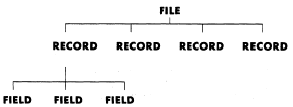 STORING AND RETRIEVING DATA The programs we have written thus far dealt with data either stored in the program with DATA statements or input via an INPUT statement at time of program execution. These statements may be sufficient when handling data that is to be processed only once. However, there are times when you will want to save your data to be used by other programs. You are restricted in what you can do with the data when it is stored in DATA statements in a program. It is impractical to update data or to use the same data with different programs. It would be very time consuming to go through all the DATA statements and make changes, or to enter all new DATA statements each time you wanted to update and/or process the data. To eliminate having to enter the data each time it is to be processed, it can be stored independently on an auxiliary storage medium such as disk or tape. This keeps the data separate from the program so that it can be used with different programs without being rekeyed. Data stored in this manner is called a data file.A data file is any group of related records, such as inventory, personnel, payroll, manhour accounting, and so on. A record is composed of stocked. Each part and all the associated data about that part (part number, part name, and unit price) would make up a record. Part number, part name, and unit price are each a field. The following example shows a pictorial breakdown of a file composed of records and associated fields.Example: