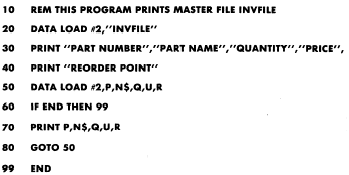 In this program, the DATA LOAD statement, line 20, opens the master file (INVFILE) and makes it available for processing. The PRINT statements in lines 30 and 40 print the column headings. Lines 50 through 80 comprise the loop which will control the reading and printing of the master file. The DATA LOAD statement in line 50 reads the values for the variables and makes them available for the PRINT statement to print. The IF END statement in line 60 checks for end-of-file. At end-of-file, control is transferred to line 99 where the END statement terminates the program.When reading a file and the end-of-file indicator is read, the computer will detect it. If any future attempt is made to read from the file before it is reopened, an end-of-file error message is printed and the computer stops executing the program. When reading a file, the BASIC statement IF END can be used to test whether the computer did, in fact, read the end-of-file indicator. It also transfers control to any specified line number in a program. For example, you could transfer control to a PRINT statement to print summary totals, or transfer control to an END statement to terminate the program as was done in this example. Depending on what computer you are using, the IF END statement is normally placed either immediately following or immediately preceding a read statement.Now that we have created and printed the master file, we can now begin to use it. For example, well need to update the file so the on-hand quantity for each item will be current and well know when a particular item needs to be reordered. The flowchart (figure 7-2, a foldout at the end of this chapter) is a pictorial representation of the procedures required to solve the problem. The problem solution has been divided into four parts: