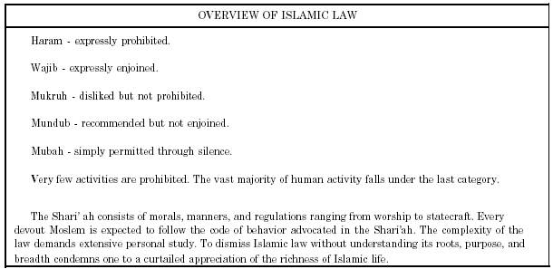 for both Christians and Jews. Another holy city, Medina, is where Mohammed and his followers gained their first great success with their religion. The historical exodus of Mohammed to Medina is called the Hegira. From this event, the Moslem calendar takes its beginning as Year One. Shari'ah Perhaps the most misunderstood aspect of Islamic life is the Shari' ah, or Islamic law. Shari'ah has as its base the following elements: l The Qur'an, the scripture l The Sums, Mohammed's words l The Ijma, the traditions and customs of the Islamic community l The Ijtihad, the individual human endeavor to understand and solve problems in the light of the Qur'an and Sums These principles governing morals and behavior are the source of Islamic legislation. Figure 1-8 provides an overview of the Shari'ah and a general definition of some of its terms. Dietary Laws Islam dietary laws require Moslems to eat only the meat of an animal that was slaughtered with a sharp knife. The knife must penetrate the innermost part of the animal's neck. During this procedure, a prayer is said to proclaim that the life of this animal is being taken to provide life for humans. All the blood is then drained from the carcass.