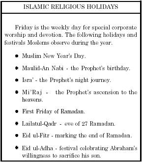 Figure 1-8.-The Shari'ah, Islamic law. Under Islamic dietary laws, all fish is permitted. Milk is permitted as long as comes from an animal that is an approved source of food. Gluttony and overindulgence in any food or drink are discouraged. In the Islamic culture, hospitality is a commitment. Holidays As an RP, you will need to recognize that Moslem personnel may request special leave or liberty to observe Islamic holidays. Figure 1-9 marks the Islamic holidays and festivals observed by Moslems during the year. RITES Islamic rites are the traditional acts of worship. These rites are duties that all Moslems must perform, no matter where they may happen to live. In fact, it is the unified duty of all Moslems to provide the way and resources so that the followers of Islam can carry out these duties faithfully. For example, before a Moslem engages in worship, Islamic law requires a pre-prayer ablution, or washing, of the body with pure water. The law demands cleanliness of the body, the clothes, and the place wherever Islamic prayers may be held. In Islam, the law and the rites of worship are inseparable essentials. Ibadat The obligatory acts of worship, or ibadat, are referred to as The Five Pillars of Islam. The ibadat includes the following acts or rites of worship: