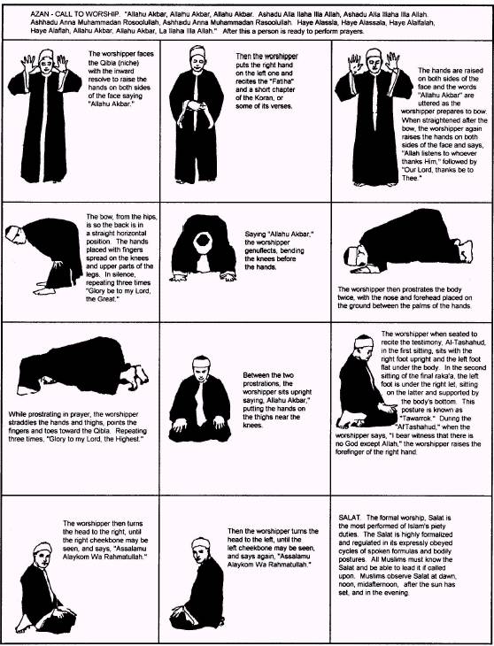 Figure 1-9.-Islamic religious holidays. . Skhahadah, the declaration of faith. Every day every Moslem must say, "There is no God but Allah, and Mohammed is his prophet." . Salat, the prescribed prayers. Salat is a recitation from the Holy Qur'an and glorification of God accompanied by various bodily postures, such as those shown in figure 1-10. The performance of Salat must