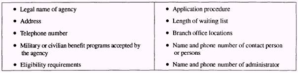 SCREENING CLIENTS One of your basic responsibilities will be to screen the persons who request appointments. To do this, you will need to obtain some basic background information concerning each client. The information you will obtain will vary according to the needs of the individual chaplain. At a minimum, you will need to obtain the following information: The full name of the visitor The rank, rate, or dependency status of the visitor The activity to which the visitor or the visitor's sponsor is assigned A complete work address The correct telephone numbers A careful exploration of the purpose of the visit, such as personal, military, financial, spiritual, or general assistance Even when you obtain the minimum information, always be aware of your responsibilities for confidentiality and for treating each client with dignity. MAINTAINING A COMPLETE LOCAL REFERRAL DIRECTORY The purpose of an information and referral directory is to link people in need to the available local sources that can provide the services they require. A directory can be an invaluable tool to Navy chaplains in their efforts to assist Navy and Marine Corps personnel and their families in meeting and overcoming the problems that they may encounter during periods of stress, illness, crisis, and other emergencies. One of your main responsibilities will be to assist the chaplain by compiling, maintaining, and providing up-to-date information for this directory. The contents of the directory should include applicable Navy, Marine Corps, and civilian programs, facilities, and organizations that can provide services for your clients. The effectiveness of the directory will largely depend upon your efforts to compile and maintain it. In most geographic areas, you should be able to find out about the local agencies and facilities that can provide services to Navy and Marine Corps members and their families. When creating a directory, be certain to contact the Navy and Marine Corps family service centers. These centers can give you excellent advice and information