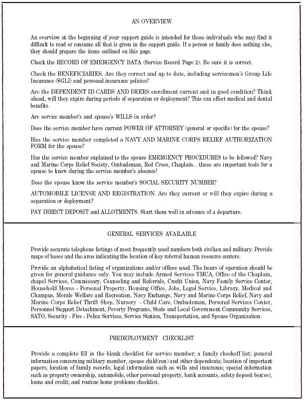 Figure 2-4.-Outline of a support guide-Continued. . The Casualty Assistance Calls Program (CACP) that aids Navy and Marine Corps families in the event of death, serious injury, or capture of a Navy or a Marine Corps member in the line of duty. The Navy and Marine Corps will detail a casualty assistance calls officer (CACO) to notify personally the next of kin. The CACO will assist the spouse or primary family member of a deceased service member in any way possible, including transportation, child care, and funeral arrangements, and submitting claims for survivor's benefits. The program is administered by the Casualty Assistance Branch of the Bureau of Naval Personnel and is governed by the Navy Casualty Assistance Calls Program, NMPCINST 1770.1, and the Casualty Assistance Calls and Funeral Honors Support Program Coordination, OPNAVINST 1770.1. Chaplain involvement in the CACP is described in the Religious Ministries in the Navy, OPNAVINST 1730.1. The Marine Corps casualty assistance program is administered by the Casualty Section, Personal Affairs Branch, Human Resource Division, Headquarters United States Marine Corps, and is governed by the Marine Corps Casualty Procedures Manual, MCO 3040.4. l The class easy message of getting important personal messages to deployed or overseas members. This is a telegram method of rapid communication families can use to send important messages-not just emergency messages-to a Navy or Marine Corps member. Either a regular telegram of 15 words or a night letter of 50 words maybe sent to deployed Navy and Marine Corps members through Western Union at favorable rates. A spouse or parent who needs to send an important message may contact a deployed member by sending a telegram to the deployed member's name and rank or rate, name and hull number of the deployed member's ship or unit, c/o Naval Communications Station, Washington, DC. me communications station will send the telegram to the ship. The cost of the telegram will be the regular Western Union rate from the place of origin to Washington, DC. Remember, emergency communications intended for all deployed military service members are channeled through the nearest chapter of the ARC. For this reason, you must encourage service members to let their family members know about this service and to have the service member's name and rank or rate, social security number, name and hull number of the member's ship or unit, as well as any other pertinent information ready to expedhe the ARC's handling and delivery of the message. |