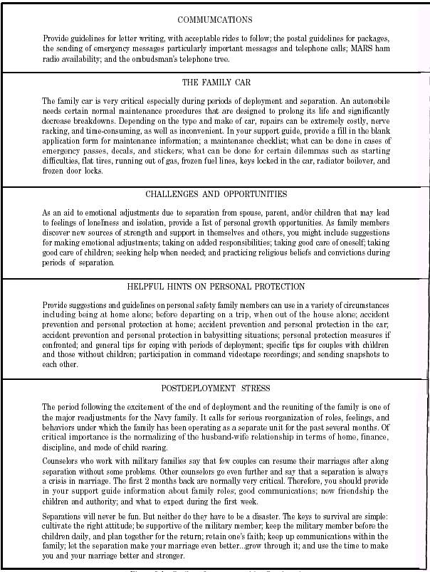 In addition, you can organize other types of personnel and their families. Remember, many different issues will lead Navy and Marine Corps personnel and their families to seek assistance from the Office of the Chaplain. You can organize this important information in a well-defined command, deployment, ombudsman, or family support guide. Figure 2-4 is an outline of a support guide that you might prepare to promote this type of program. UNDERSTANDING SPECIAL PROBLEMS In your career as an RP, you will discover that some of the most pressing issues that lead personnel and families to seek assistance include separation and deployment; alcohol and drug dependency; services for single members, families, and children; retirement and aging; and resources management services. In developing and maintaining an effective, comprehensive directory and maintaining a sensitive and caring attitude, you will play a major role in helping many people get through these difficult situations. Let's take a closer look at some of the special problems facing