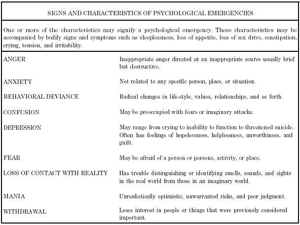 Recognizing a Psychological Emergency You may not always be able to immediately identify a state of serious emotional upset, but you should be able to recognize some common signs and characteristics of a psychological emergency, such as those listed in figure 2-9. A crisis may occur at any time. A crisis may erupt from any event, such as an environmental or material condition, a personal or physical event, an interpersonal or social situation, during any life cycle passage associated with the normal facets of human growth, and during life cycle transitions that signal a change in social status. The key to recognizing and understanding a psychological emergency resulting from a crisis is the term emotional. People have feelings about the things that happen to them in life. These feelings can incapacitate them. Most people prefer to be in charge of their own lives and hate to admit they cannot cope.