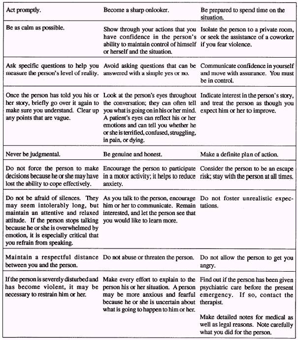 Figure 2-9.-Signs and characteristics of psychological emergencies. Responding to Psychological Emergencies reaction, your nonthreatening manner, and courtesy, as well your tone of voice that will mark true compassion in guiding an overwrought person to a calmer demeanor. Figure 2-10 offers some insight and choice, trained chaplains react appropriately. You, guidelines you can use in responding to situations too, must act appropriately. Often it will be your involving distraught persons. When reality strikes and coping is no longer a