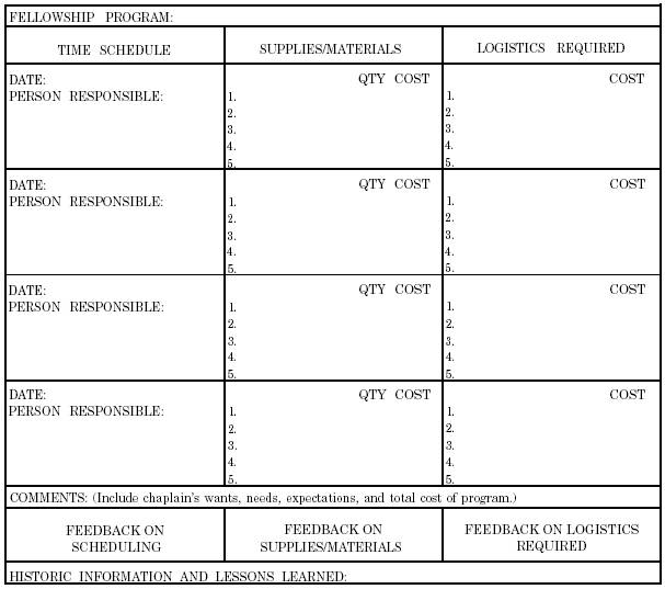 Figure 2-12 illustrates a program plan showing what diagramming for fellowship may look like. Make your diagram of the fellowship activity a program plan that follows a step-by-step general approach. Your plan should include scheduling and determining milestones, planning for supplies and materials, and evaluating logistics requirements. PROVIDING SUPPLIES AND MATERIALS Quality control and reliability in planning for supplies and materials for fellowship programs should be documented in your program plan. The fellowship program plan, such as the one outlined in figure 2-12, will become a tool of ground rules and guidelines for you and other RPs to use to manage fellowship programs. To develop your plan, you must perform a total task identification. Include every possibility as well as a cost analysis. Let the chaplain or fellowship program coordinator determine what is essential and what is not. The effectiveness of the fellowship program will develop from that point.