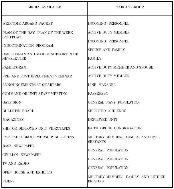 PRINTED MATERIALS AND PUBLICATIONS Your CRP will use printed materials to send out information concerning religious programs within the command. Your RMF can either procure this material or prepare it locally. Types A few types of printed media that you can use to distribute information about the RMF's CRP to military persons and their families are presented in figure 2-19. The primary target group for each medium is also indicated. In the following paragraphs, let's take a look at some of these media. Worship Bulletins Bulletins are printed outlines of worship containing devotional and religious rites, funerals and memorials, seasonal observances, holy days, or announcements. Worship bulletins regularly provide assembled congregations with an order of worship. Worship bulletins fulfill a variety of purposes. In fact, worship bulletins are an appropriate medium for almost all types of religious events. SAMPLES.- You can find samples of prepared bulletin covers in the most current edition of NAVSUP Pub 2002, Section II - Forms. You can order these samples by filling out a DD Form 1348. For Marine Corps activities, you can order sample bulletins through the unit/activity supply office. Worship bulletins appropriate for specific faith groups, or certain events, may be obtained through a variety of religious goods stores. FORMATS.- A photoready copy of a standard worship bulletin is 8 1/2 inches-from top to bottom-by 11 inches-from side to side, or 8 1/2 inches by 14 inches. The form may be divided in half. In this case, one page of the bulletin will be on one half and the concluding portion will be on the other half. Another option is a three-column bulletin that can be trifolded. Figure 2-20 illustrates a typical bulletin for a Protestant service showing a variety of application options. Note the use of graphic lines, shadow, bold, and different font sizes. PRODUCTION.- Using a word processing application program will allow you to use your imagination to produce clear, imaginative, innovative, and attractive bulletins. In addition to graphic lines,