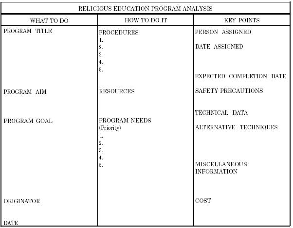 Figure 3-1.-Diagramming a task. Now that you have read about the various roles involved in providing religious education, let's take a closer look at the role you will play in this important area. In the following paragraphs, we will look at some of the tasks for which you, the RP, will be responsible and the skills you can gain as you turn religious education opportunities into positive situations that will affect many people. ROLE OF THE RP IN RELIGIOUS EDUCATION The area of religious education offers many opportunities for you, the RP, to develop important professional skills, In carrying out your responsibilities in developing and implementing your CRP's religious education program, for example, you will have many opportunities to develop and enhance your own skills in the following areas: . Diagraming program support requirements Training religious education volunteers in the use of audiovisual/media aids Coordinating logistics support Coordinating religious education program enrollment Rigging and unrigging religious education programs Compiling and reporting religious education statistics In the following paragraphs, let's take a look at some of the professional skills you will gain as you carry out these important responsibilities. DIAGRAMMING PROGRAM SUPPORT REQUIREMENTS As an RP, whether you work in the area of religious education, worship, religious program support, library, or administration, you will be responsible for diagraming program support requirements. As your Navy tasks become more and more complex, the jobs or skills associated with your day-to-day operations, maintenance, and even repairs will tend to increase in complexity. As a result, the task of diagraming the program support requirements of these skills and jobs will become more exacting, and you will likely discover thorough and conscientious preparation to be an absolute need. Diagraming program support for religious education means simply reading and following a diagram. For each particular task you should be provided with an outline or diagram. It should contain both a step-by-step method for performance and some factual information closely associated with the task. Figure 3-1 shows an outline you can use to diagram a task. To diagram a task, simply fill in the outline. |