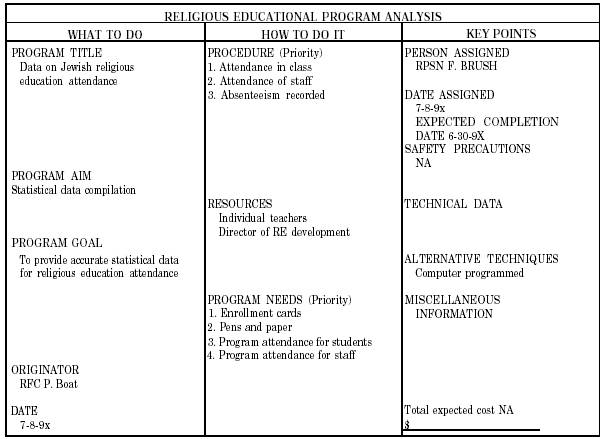 RELIGIOUS EDUCATION PROGRAM ANALYSIS One method you can use is to fill in the outline at the same time you are preparing to perform the task. If the task is new or if it is a complex one, you should actually perform it, slowly, one step at a time, to determine how to describe it. At each step, ask the following questions: l Is this the most efficient way to perform this step? l Is this the quickest way? l What safeguards can I stress? l IS this the most economical way? l Is this program all-encompassing of other faith groups? l What related facts should be given? The diagrammed analysis shown in figure 3-2 shows an outline that has been filled in for a skill that is primarily computational in nature. The task diagramed in figure 3-2 is compiling data on Jewish religious education attendance. Notice how the RP has filled in the different categories in the outline.