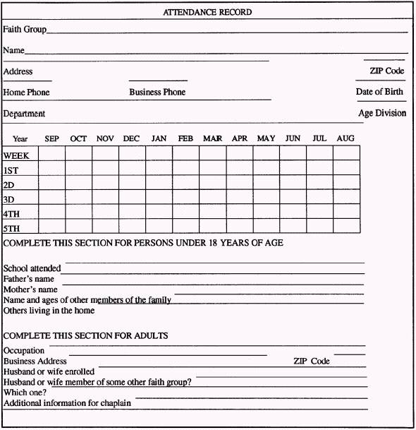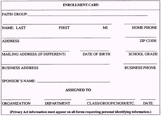 COORDINATING RELIGIOUS EDUCATION PROGRAM ENROLLMENT One way to explain coordinating religious education program enrollment is to picture how you want everything to be, then list the steps to be taken to bring that picture to actuality. You are important to a person who is enrolling in religious education because that person is taking an important step. He or she has a need and a desire to be ministered to. The purpose in enrolling a person reaches far beyond the need for information. It is the opportunity to develop a relationship, a tie, with that person. Contributing to the enrollment process for each faith group must be a high priority for every RP. Promoting Enrollment One concept of enrollment calls for actively seeking out people anywhere or anytime to enroll them. If they agree, the chaplain or faith group leader places them on before they attend. the roll. This concept encourages people to enroll even You should make every effort to encourage enrollment, even when the circumstances may tempt your RMF to limit the number of people enrolled. Not having enough teaching units, enough workers, or enough space should not lead you to control your enrollment. Instead, these circumstances should challenge you to begin new classes, discover and enlist more workers, and provide more space. Once the people are enrolled, you must keep records of the enrollees. You can also use this opportunity to promote your CRP's religious education programs. Display attendance boards prominently. Call attention to the enrollment figures. Maintaining Enrollment and Attendance Records You can use an enrollment card such as the one shown in figure 3-3 to keep a permanent file of the master enrollment.