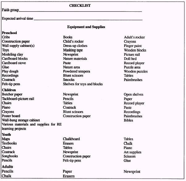 Figure 3-4.-Attendance record card. 3-6 advance so you can discuss these needs with the religious education directors and teacher-volunteers. In preparation for enrollment day, gather construction paper for use in making name tags, scissors, felt-tip markers, and masking tape. You may want to create banners with a theme. Create two posters with enrollment instructions, one for those already enrolled and another for prospective enrollees. Arrive early to setup an enrollment room. Provide enough chairs for expected attendance and, by all means, have an adequate supply of enrollment cards on hand. RIGGING AND UNRIGGING RELIGIOUS EDUCATION PROGRAMS There are several important lessons every RP must learn about rigging and unrigging. First, always allow yourself enough time. Second, everything has its place and everything should be in its place. Third, make yourself a checklist, review the checklist, then review the checklist again. Finally, remember the one small detail you might forget will get you in trouble every time. The more organized you are, the better the religious education program will be. Having an all-inclusive checklist will be an asset. Figure 3-5
