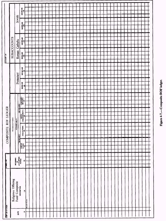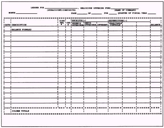 Figure 4-8.-Subaccount ledger. cross-reference each of your files so you can find its location in the CRP central annual files. SUMMARY No one person will have the overall responsibility for all actions required in making the ROF an effective tool for the control and accountability of funds received and disbursed. Some individuals such as the commander, commanding officer, and command chaplain (administrator) are responsible and held accountable for the overall management of this nonappropriated fund. You, however, as the RP, will be responsible and accountable for your duties and responsibilities associated with this fund. It is, therefore, important for you to familiarize yourself thoroughly with the contents of SECNAVINST 7010.6. In this chapter, we have tried to touch upon your basic duties and responsibilities for a CRP's ROF. In the actual administration of an ROF, you should realize that you may be required to perform additional tasks, depending on the command to which you are assigned. |