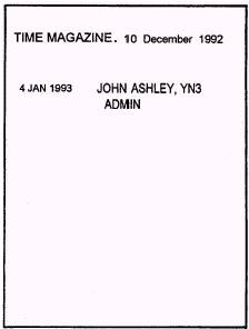 Other Materials A shipboard library should be equipped to loan other types of materials such as back issues of magazines and newspapers and some types of tapes. The circulation policy will depend on the type and currency of these materials. MAGAZINES AND NEWSPAPERS.- Magazines and newspapers are not checked out, but are for use in the library. However, back issues of magazines may be loaned if suitable arrangements are made. To arrange this, prepare a card, as shown in figure 5-5, to identify the magazine. This type of card may also be used for other nonbook materials. Have the borrower print his or her name, rank, and division on the card. Stamp the card and front cover of the magazine with the due date and file the book card behind the date due in the circulation file. Loan periods for magazines should not exceed 1 week.