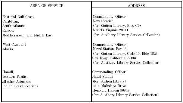 Figure 5-5.-Check-out card for magazines and other nonbook materials. TAPES.- Tapes borrowed solely for use in the library may simply be logged in and out. The tape log should list the tape number, name, rank, and division of the borrower and date and time borrowed. When the borrower returns the tape, the library assistant logs the time in and refiles the tape in the cabinet according to its number. Tapes borrowed for use in other spaces aboard ship are checked out as books. The borrower should print name, rank and division on the tape card The library assistant stamps the date due (day, month, year) on the card and files it in the circulation file alphabetically by performer behind the date due. The loan period for tapes should not exceed 3 days. Check-in for tapes is handled the same as for a book except the library assistant replaces the card in the card file in the tape cabinet. Interlibrary Loan Policies You should understand interlibrary loan policies and procedures. Interlibrary loan is a borrowing procedure your library can use to borrow materials from other libraries. This procedure enables the shipboard library to meet the needs of library patrons who have serious research and study needs that cannot be met from the library's existing collection or book stock. The Interlibrary Loan and Photocopy Request, Standard Form 162, must be used for interlibrary transactions. These forms are available in General Services Administration (GSA) stock or may be purchased from commercial library supply sources. Navy Auxiliary Library Service Collections Unlike interlibrary loans, Navy auxiliary library service collections (ALSCs) provide materials directly to members of the naval service upon personal letter request. The materials in the ALSC are primarily books that are of timely significance to naval personnel for their intellectual and professional growth and development. Usually these books have been reviewed or otherwise highlighted in such professional journals as the Naval War College Review or the Proceedings of the U.S. Naval lnstitute. Many books in the ALSC are also available in some of the larger libraries, but if a crew member requests a book that is not available locally, it may be borrowed from an ALSC. To borrow one or more books, individuals should write a personal letter to the appropriate ALSC. Figure 5-6 identifies the ALSCs and the areas they serve. Overdue Materials Concerning the return of library materials, library directives set the basic command policy under which the library operates. In general, the procedures for processing overdue materials include the following steps: l The first overdue notice is sent to the person concerned 3 to 5 days after materials were due. l The second overdue notice is sent, again to the person concerned, 3 to 5 days after the first notice. l The third overdue notice is sent to the person's division officer for action, 3 to 5 days after the second notice. Personnel leaving an activity also should checkout with the shipboard library before detaching. Fees and Fines Fees may not be charged for use of materials in naval general libraries. When library materials in circulation are lost, damaged, or destroyed by means other than natural disasters or like incidents, persons responsible must replace the lost materials or reimburse the U. S. Government for the value of the materials. PROCESSING LIBRARY MATERIALS Before crew members can borrow or use the library's materials, the materials must be processed and