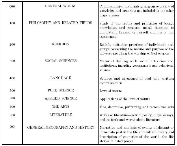 Clothbound books and Quality Paperbacks When clothbound or expensive paperback books are received by the library, they are usually accompanied by a packing list or catalog cards containing specific information the library staff can use to process the materials for circulation or reference. If this information is not included in the book shipment, either you or a library assistant must determine the classification for each of these materials. The library officer can usually determine the author, title, and category (fiction or nonfiction) of each of these books by consulting appendixes Cb and Cc of the Dewey Decimal Classification and the Subject Heading Index of the General Library Manual. The library staff, however, may need to complete the classification process. (This process is also known as cataloging.) The 10 major subject classes of the Dewey Decimal Classification, including a general explanation, are shown in figure 5-7. Before any clothbound or quality paperback book is loaned to a crew member, you or another member of the library staff must complete the following steps: