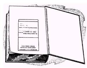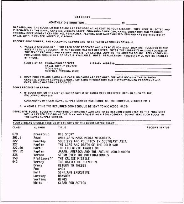 Figure 5-8.-Sample clothbound book distribution packing slip. Attach the book-card pocket to the page facing the back cover of the book. As shown in figure 5-9, place the book card in the pocket. Stamp the pocket with the ship's property stamp. Prepare a spine label for each book. Labels for fiction books should include the letter F and first three letters of the author's last name. Science fiction books are designated SF, westerns W, and mysteries M to assist patrons in identifying these types of books. Nonfiction book labels should include the Dewey decimal subject class number (as given on the packing slip or catalog cards) and the first three letters of the author's last name. Attach the finished label (at a uniform height) to the lower portion of the book's spine or book's paper cover. As shown in figure 5-10, place labels for books that are to be housed on a shelves with lips about 2 inches above the bottom of the book so the label can be easily seen. Occasionally, due to the texture of a book's binding, pressure sensitive spine labels will not adhere. In such cases, print the spine identification directly on the book's spine with a library marking pen designed for this job. Protect books by encasing them in plastic book jackets. The book's paper cover inside the plastic jacket adds colorful eye appeal to the library and preserves cover illustrations and printed information that will assist the user. When plastic jackets are not available or can not be used, paste the information printed on the back and inside flaps of the paper cover inside the front cover of the book. Prepare catalog and shelflist cards for each book. Each fiction book is accompanied by three catalog cards-two author cards and a title card. On each author