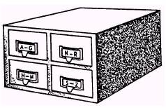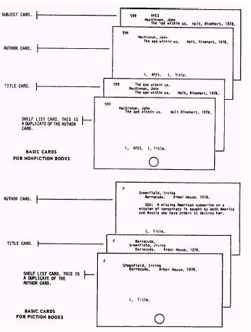 Figure 5-14.-Sample card catalog file. collect for filing since they are of no use to patrons until they are filed.) The shelflist is an official record of the library's holdings. It contains one author card for each book in the collection. Shelflists are not for patron use and should be kept in a secure place. File shelflist cards for fiction books alphabetically by author, as shown in figure 5-16. File shelflist cards for nonfiction books numerically by class number, as shown in figure 5-17. These files should represent the order in which the books are shelved. File the shelflist cards when the processed books are shelved. (Shelflist cards should not collect for later filing.) The shelflist should resemble the sample shown in figure 5-18. |