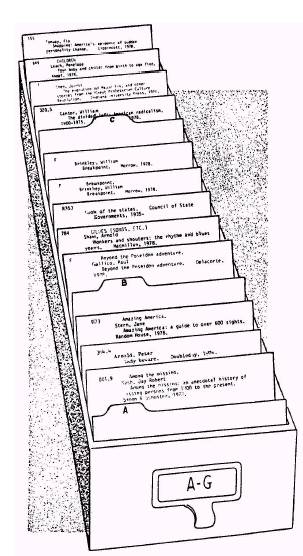Figure 5-15.-Alphabetical arrangement of card catalog files. paperbacks in random order apart from the classified cloth collection. Tapes Tapes from NETPMSA, Pensacola, Florida, are shipped with an itemized packing list. Receipt and verification of tapes must be carried out following the letter of instruction forwarded to the ship. A library inventory log must be maintained for tape collections. Each tape should be assigned a number (1, 2, 3, 4) and inventoried in the log by number with performer, title,