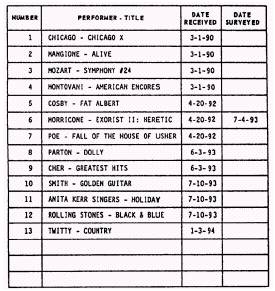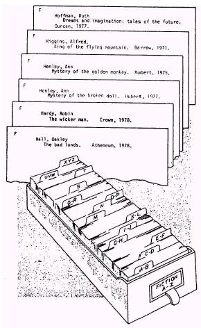 Figure 5-16.-Alphabetical arrangement for fiction shelflist cards. and date of receipt information, as shown in figure 5- 19. Tapes should be stored by log number in secured cabinets. The library should post a list of tapes available. This list may be a copy of the log record. Proper marking of tapes is difficult due to their form. Audiovisual labels are available from library supply houses. Some cassettes also can be marked with library lettering pens or electrical styluses. No additional processing is needed for tapes to be used solely in the library. Libraries that loan tapes for use in other ship spaces should prepare a book card for each tape. The card should list the tape's number, performer, and title. Tape cards should be kept on file by tape number in the tape cabinet, as shown in figure 5- 20.