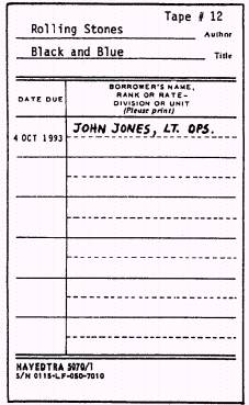 Figure 5-20.-Card for tape check-out. Magazines and Newspapers For processing magazines and newspapers, simply stamp these materials with the ship's property stamp when you receive them and display them for use. |