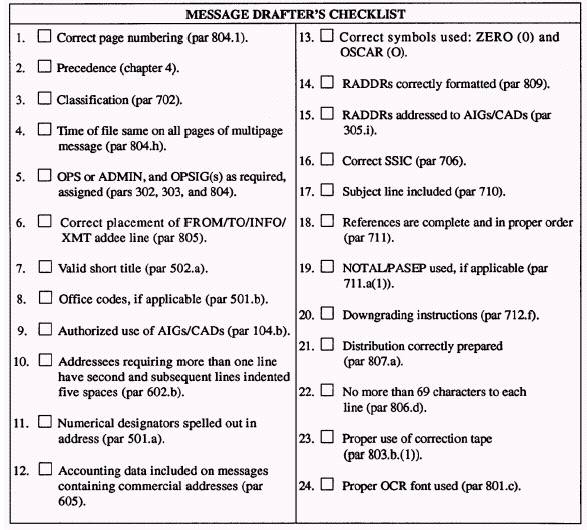 TELECOMMUNICATION MESSAGES The Naval Telecommunications System provides a message service to its users within the Navy. Message traffic is often essential to the functioning of the chaplain's office. Users must prepare naval messages in a standard form. The Telecommunications Users Manual (NTP3(H)) contains detailed procedures for drafting and typing naval messages. In fact, the Navy expects you to follow this manual so exactly that "all outgoing messages of ROUTINE precedence that are not prepared according to ACP121 US SUPP-1, JANAP 128, and this publication, or contain errors of any kind that will impede processing and/or delivery will be returned to the originator with notification of corrective action required." Common practice will increasingly require you to use a computer to prepare message traffic. The most common messages you will see are operational messages and administrative messages. Operational messages are those directing or affecting the actual use or movement of forces, ships, troops and aircraft; issuing reports affecting the safety of lives, ships, forces, or areas; and message traffic relating to exercises conducted for fleet training and readiness. Administrative messages pertain to matters of such a nature or urgency including reports, perishable information, matters associated with operations and readiness, and urgent matters requiring considerable coordination or that must be brought to the early attention of seniors. Most messages originating in the chaplain's office will be administrative. You must also be familiar with the United States Navy Plain Language Address Directory, USN PLAD 1. This is part of the Message Address Directory that contains authorized message addresses. Figure 6-5 shows a message drafter's checklist you can use when preparing a message for release. (The paragraph References refer to the location of these guidelines in the official publication.) Communication means many things to many people. Letters, memorandums, reports, pamphlets, and booklets may come to mind to some. But others may think of modern communication devices such as the