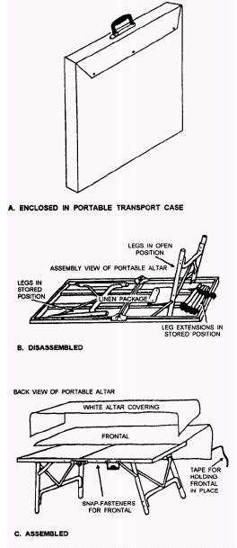 Figure 6-6.-Portable Lee field altar: A. Enclosed in portable transport case; B. Disassembled; C. Assembled. assembled position as it is being made ready for use. Unfolded and assembled for use, the Lee altar measures 39" X 60" X 24." Folded and in its canvas case, it measures 24" x 3 1/2" x 30." When the altar is in its stored state, the linen package (contained in its canvas pouch) is folded into the center, as shown in view B. When the altar is assembled for use, the linens are removed from the pouch. The linens with this altar include only one frontal. The frontal is in a liturgical color but has no faith group symbolism. As shown in view C, the frontal covers the front of the altar and is held in place by a row of snap fasteners located along the back edge of the altar and two tapes that tie around the front legs. The white altar cloth included in the linen package is used to cover the top of the altar. (The altar appointments are then arranged on this surface.) The altar frontal must be dry cleaned whereas the altar cloth may be laundered. The portable Lee altar should be erected in the following manner: 1. Remove the portable altar from its carrying case. 2. Open the altar to its full length and lay it top down. 3. Raise the legs, one at a time, to the open position. 4. Remove the four leg extensions from the stored position. 5. Insert one leg extension in each leg. 6. Remove the frontal and altar cloths from the linen package and set them neatly aside. 7. Turn the portable altar over into an upright position making sure it is placed in a secure and steady position. 8. Place the frontal on the altar so that it overhangs the front of the altar. Connect the snaps on the frontal to the fasteners on the rear of the altar. 9. Locate the two tapes attached to the frontal and tie them to the portable altar front legs. 10. Place the altar cloth on the altar leaving an equal amount of overhang on each end of the portable altar. By design, the aluminum portable Lee altar is used for interdenominational religious services in field and combat conditions. Because of its practical and nonsectarian design, the portable Lee altar is adaptable for Protestant, Catholic, or Jewish divine services. In the following sections, you will read about how you will use this altar to assemble the appointments contained in your chaplain's combat or field kit for each of these services. |