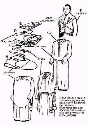 LAYING OUT ROMAN CATHOLIC EUCHARISTIC VESTMENTS.- To lay out Roman Catholic vestments properly, you should have the following items available, most of which are shown in figure 6-12: Alb (1) Cincture (1) Chasuble (1) and stole (1) in the color of the season Field table for displaying the vestments (1) Cassock (1) (optional) Amice ( 1 ) (optional) NOTE: The cassock and amice are optional, depending on the preference of the Roman Catholic chaplain. To lay out the Roman Catholic Eucharistic vestments, take the following steps (fig. 6-12): 1. Lay the chasuble (A) on the field table (or any suitable surface) with the front facing down. Use the following guidelines to distinguish the front of the chasuble from the back. a The manufacturer's label is on the inside of the back collar. b. If there are snaps or a zipper, they will be located on the front left shoulder. c. The back is usually larger than the front.